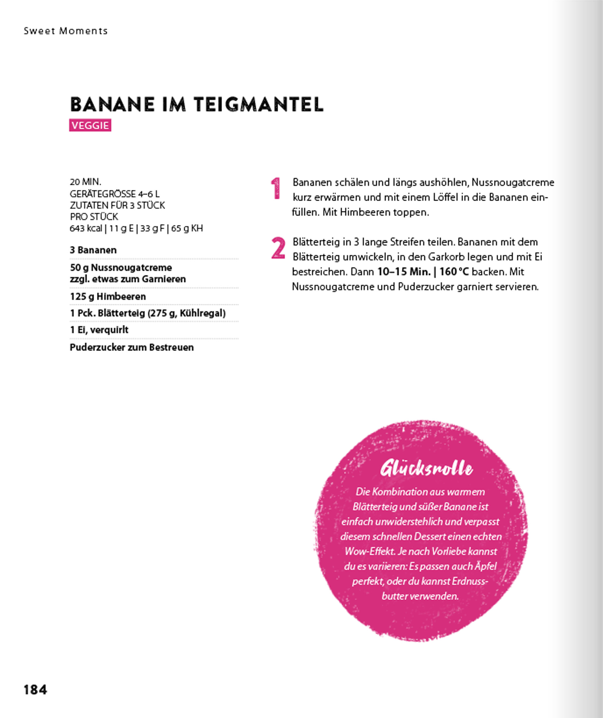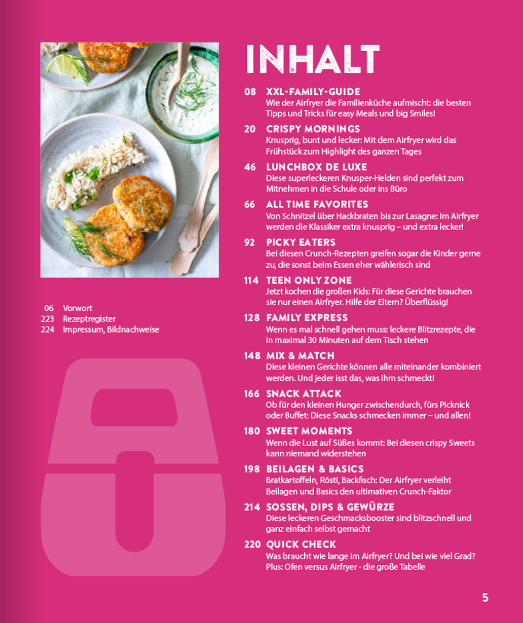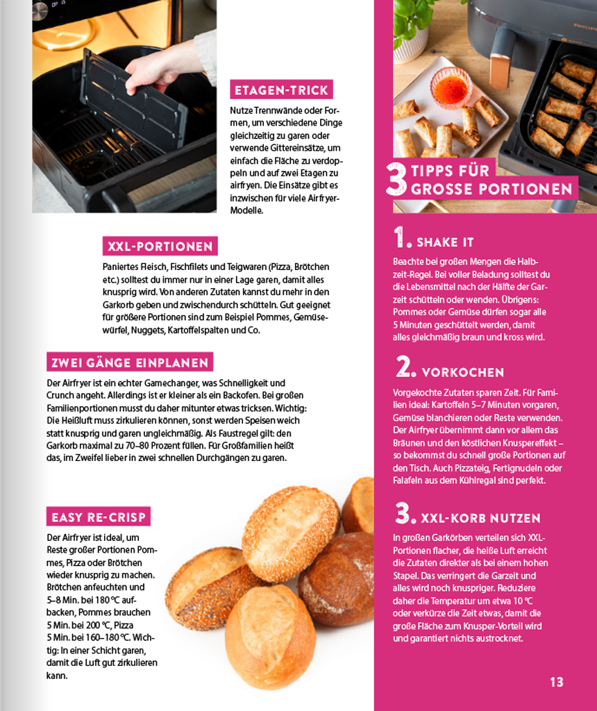 Hier kommt alles auf den Tisch, was die ganze Familie liebt. Dabei liegt der Fokus auf Zeitersparnis und Praxistauglichkeit: Neben klassischen Familiengerichten wie Schnitzel oder Aufläufen, die durch den Airfryer einen modernen Twist erhalten, liefert das Werk konkrete Lösungen für typische Alltagsprobleme.