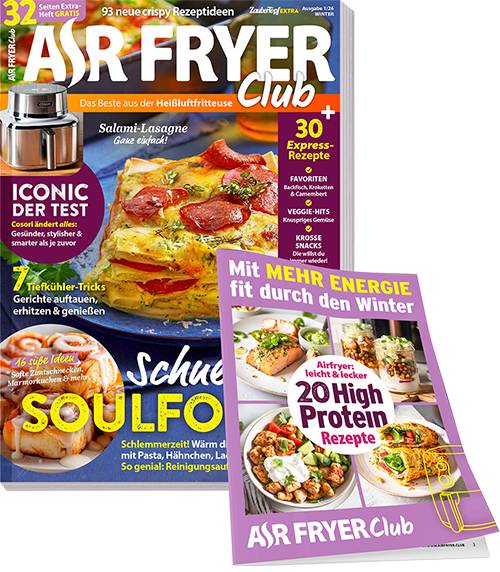 On top wartet dein exklusives Geschenk: Ein 32-seitiges High-Protein-Booklet mit 20 Rezepten, die Energie geben und durch die kalte Jahreszeit begleiten. Einfach durchblättern, Lieblingsrezepte markieren und direkt losfryen!