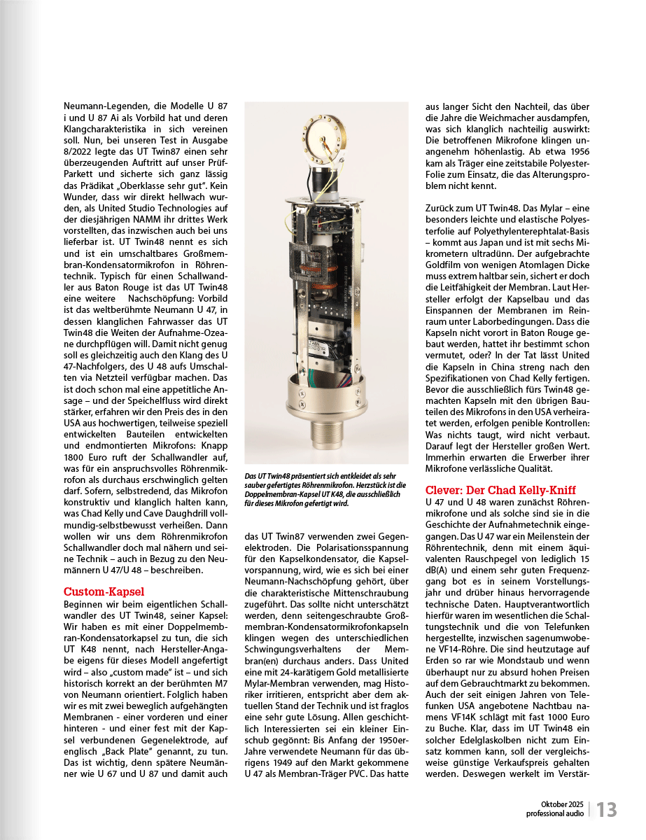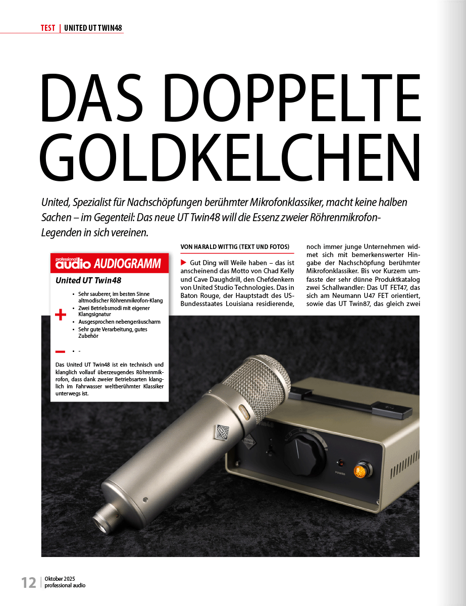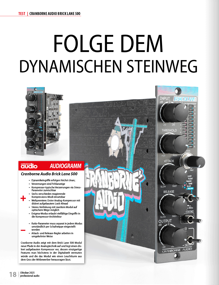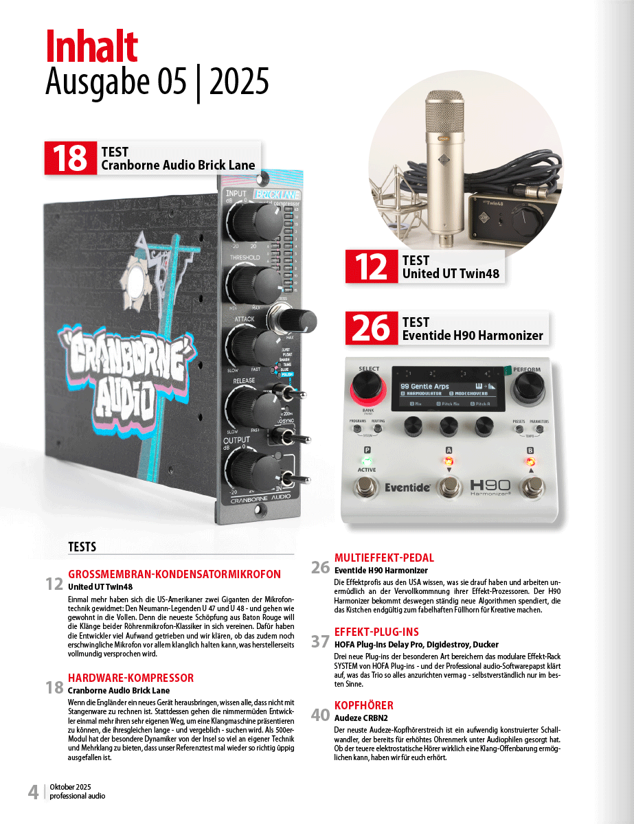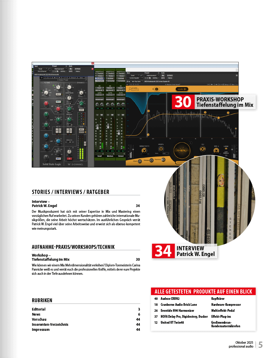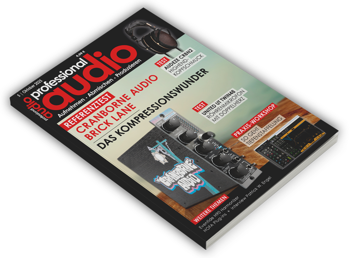 Auch wenn der Herbst momentan eher grausuppig aus der Terrine schaut – professional audio enthält viele Themen, mit denen sich Oktober und November vergolden lassen. Endlich konnten wir eines der wenigen Testexemplare des heiß begehrten Brick Lane von Cranborne Audio ergattern. Unser besonders umfangreicher Referenztest beantwortet alle Fragen zu Technik und Klangpotential des Hardware-Kompressors. Im klanglichen Fahrwasser zweier Neumann-Legenden will das United UT Twin48 reisen – und wir haben uns das Röhrenmikrofon aus Baton Rouge ganz genau angesehen und angehört. Die sensiblen Ohren waren auch zu spitzen im Falle des Edel-Kopfhörers Audeze CRNB2, der neue Maßstäbe im vornehmen Elektrostaten-Club setzen könnte. Doch Tests alleine machen die neue Ausgabe noch nicht höchst lesenswert. Ein Top-Beiträg ist definitiv der neue Workshop von Diplom-Tonmeisterin Carina Pannicke, die offenbart, wie ihr euren Mischungen Mehrdimensionalität verleiht. Schließlich plaudert auch noch der von internationalen Künstlern hochgeschätzte Musikproduzent Patrick W. Engel im Exklusivinterview aus dem Nähkästchen.