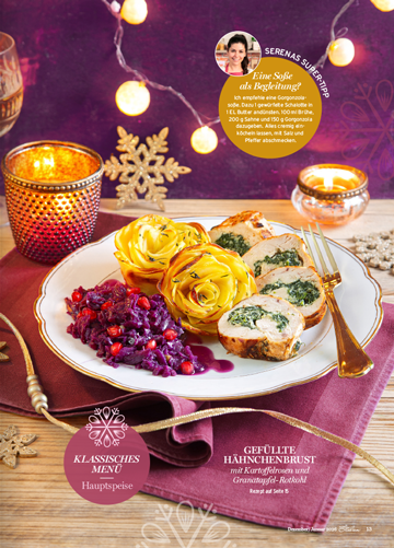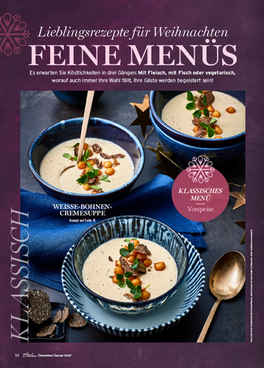 Für unsere diesjährige Weihnachtsausgabe haben wir nicht an Glitzer gespart und auch nicht an Rezepten, die am Fest und auch in den Wochen davor und danach für leuchtende Augen sorgen. Freuen Sie sich auf unsere drei Vorschläge für das Festmenü in drei Gängen, bei denen einmal Fleisch, einmal Fisch und einmal ein vegetarisches Gericht die Hauptspeise bilden.