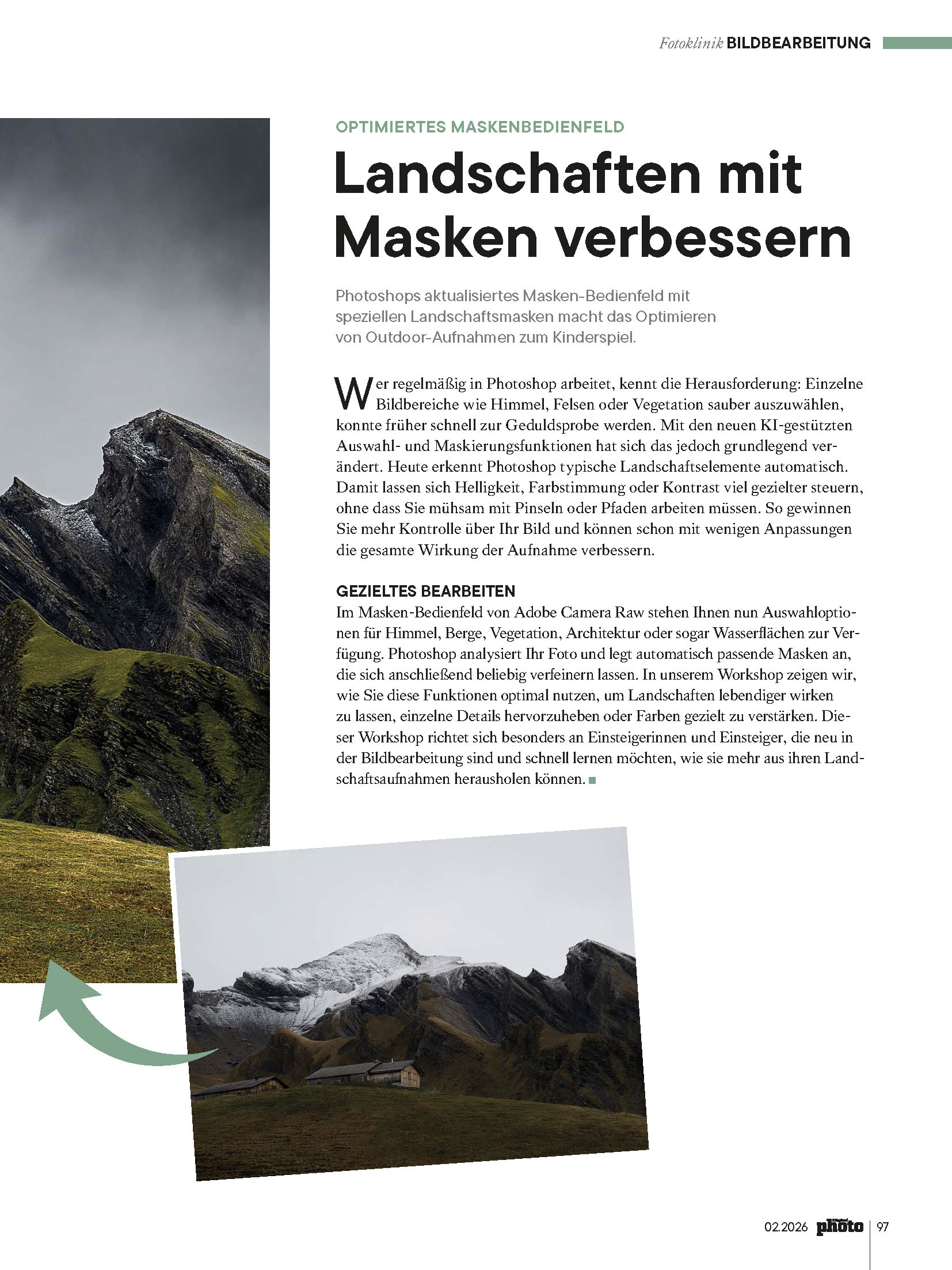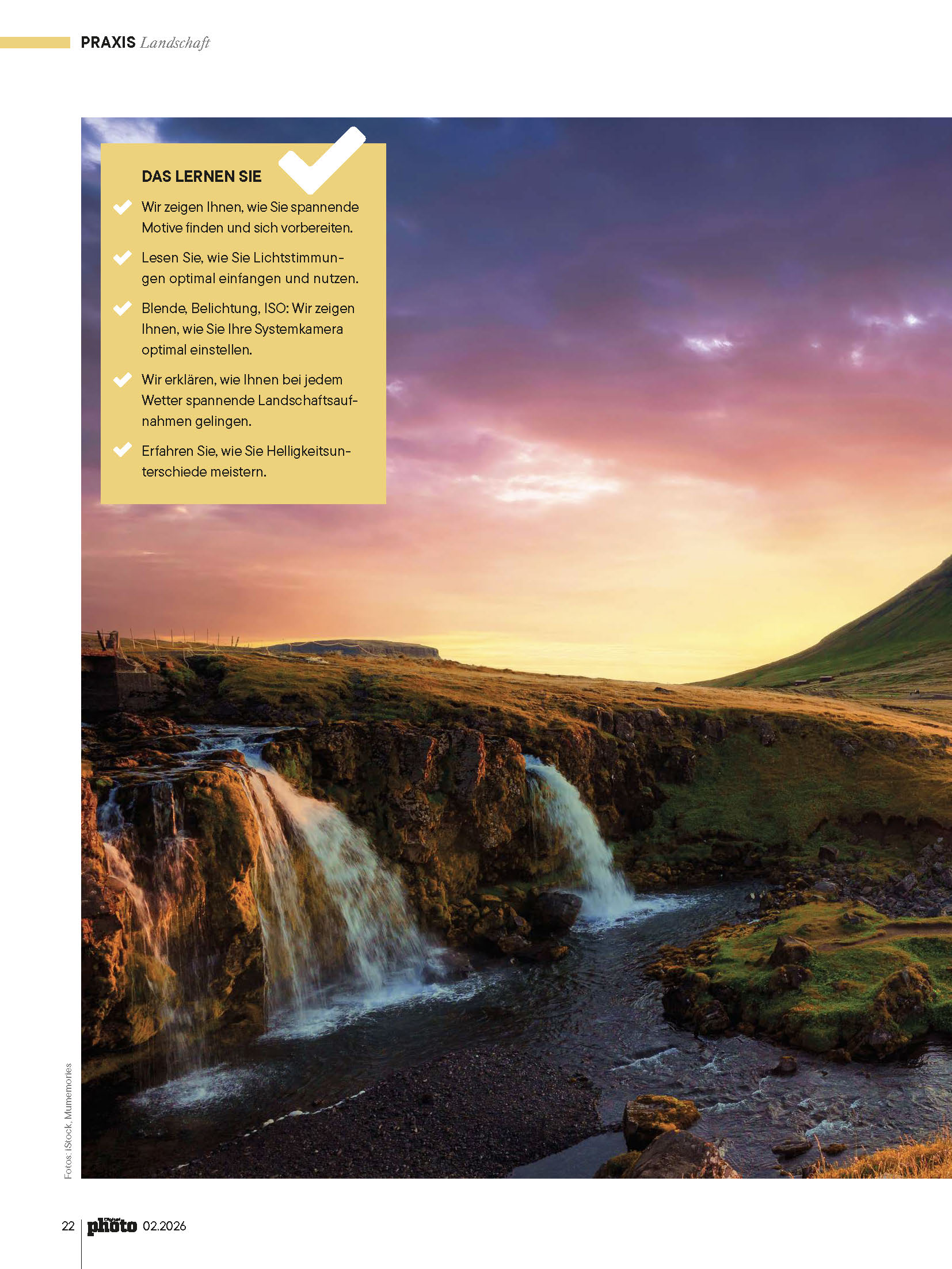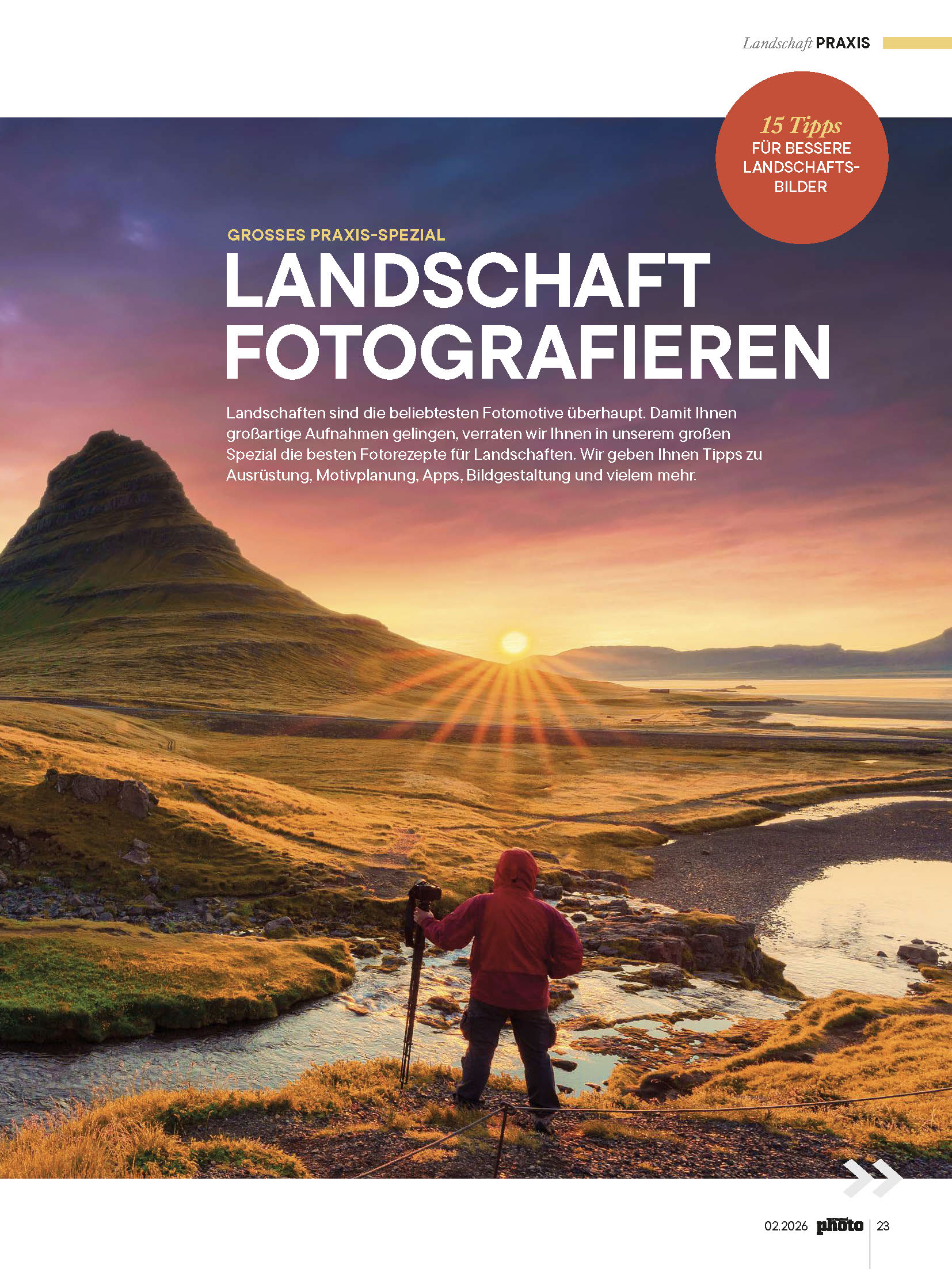 Entdecken Sie in dieser Ausgabe, wie Sie die Natur perfekt in Szene setzen. In unserem 28-seitigen XXL-Spezial lernen Sie alles über die Motivsuche, den idealen Dynamikumfang und den gezielten Einsatz von Licht für atemberaubende Landschaftsaufnahmen.