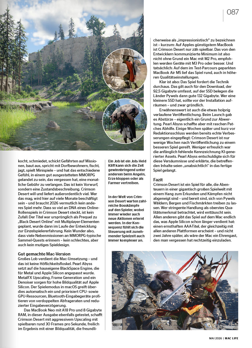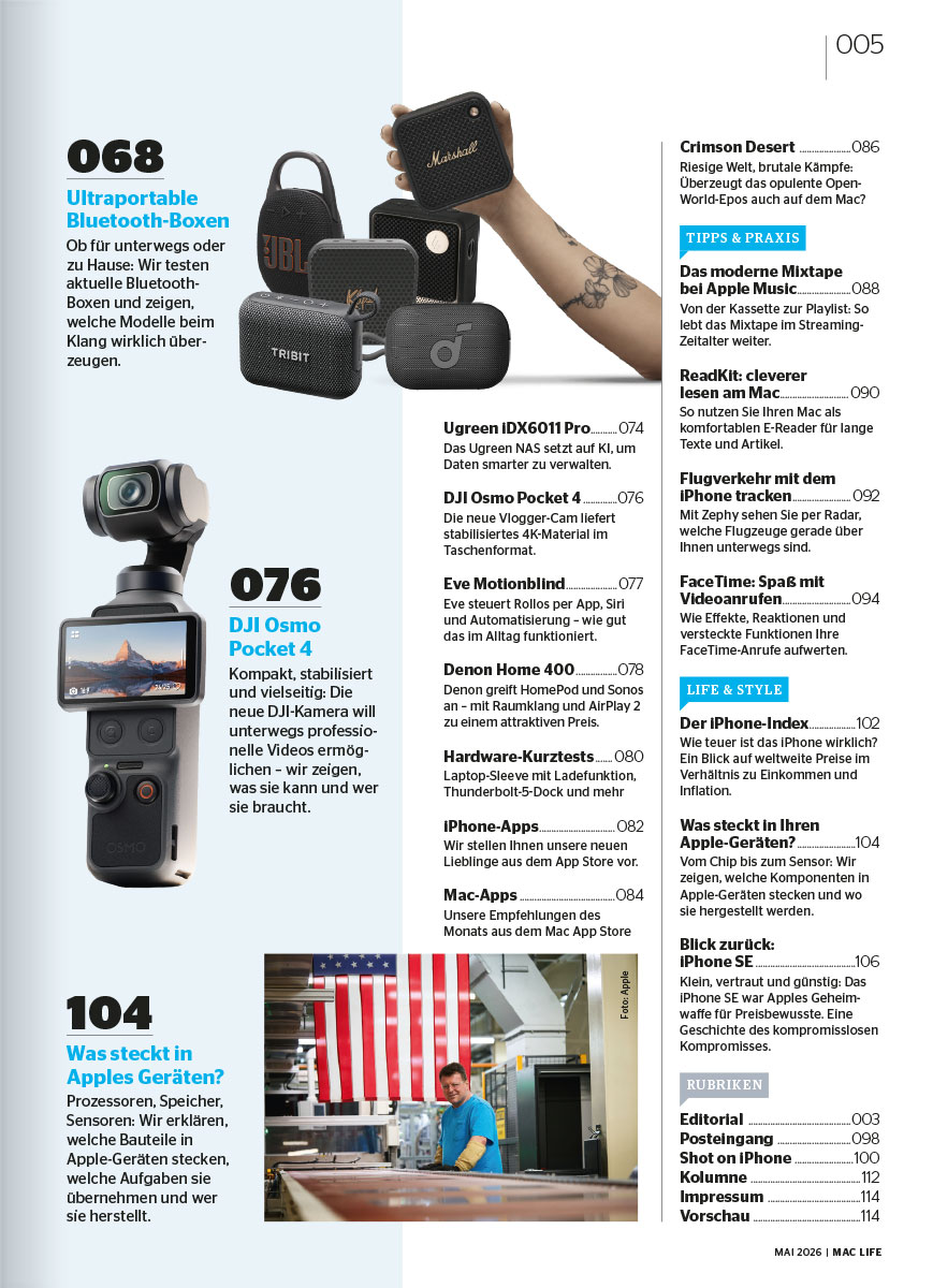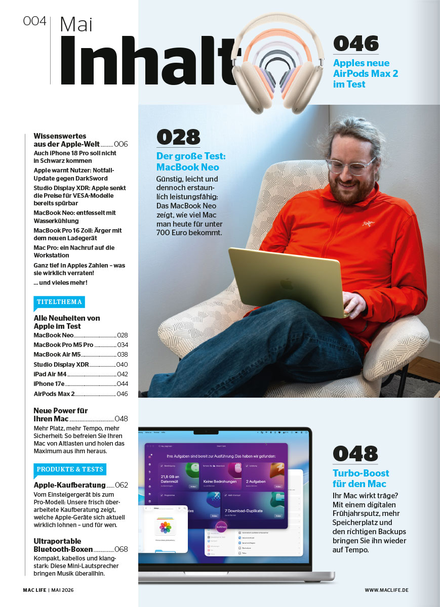 Praxis, die Sie weiterbringt: Machen Sie Ihren Rechner fit für die Zukunft! Unser 13-seitiges Frühjahrstuning bietet exklusive Praxis-Workshops, mit denen Sie jedem Mac einen ordentlichen Turbo-Boost verpassen. Zudem erwarten Sie über 100 Seiten vollgepackt mit Tests und Praxis-Tipps zu iPad Air M4, FaceTime-Optimierung und sogar Gaming-Highlights wie "Crimson Desert" auf dem Mac.