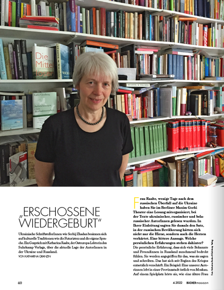 Mit der Osteuropa-Lektorin des Suhrkamp Verlages sprachen wir über die aktuelle Situation der ukrainischen Schriftsteller:innen: „Alle helfen, wo sie können, nehmen Flüchtlinge auf, sammeln Medikamente und militärische Ausrüstung, geben Interviews, schreiben Artikel für internationale Medien. Gedichte oder Tagebuch, sagen alle, das geht. Aber an längerer Prosa zu arbeiten ist momentan ausgeschlossen.“ (ab S. 40)