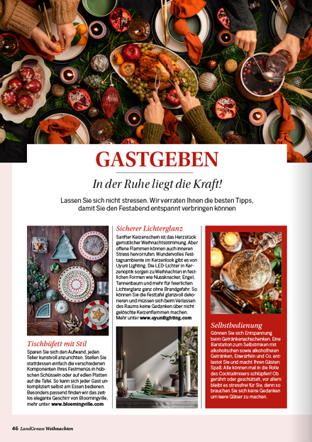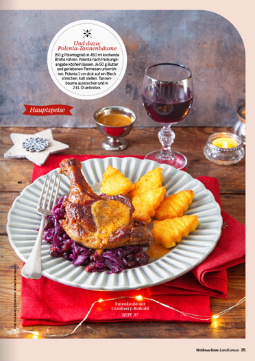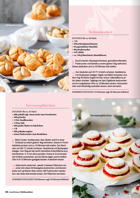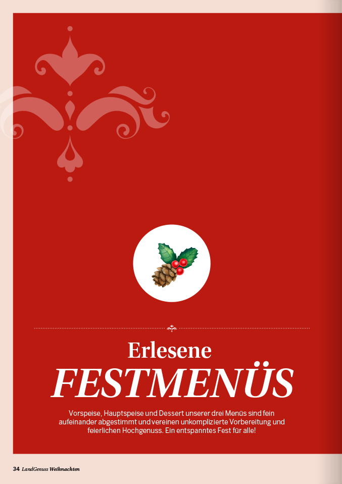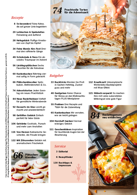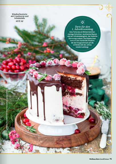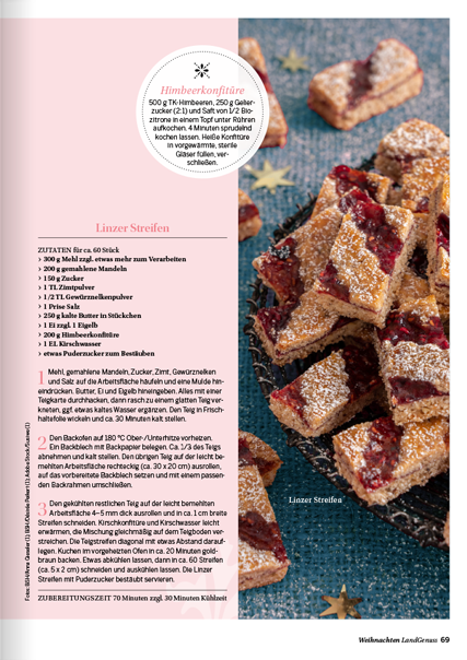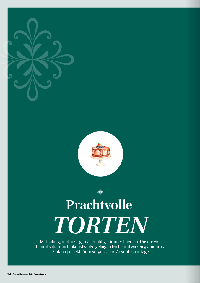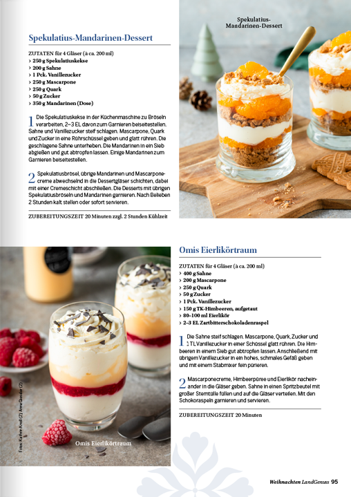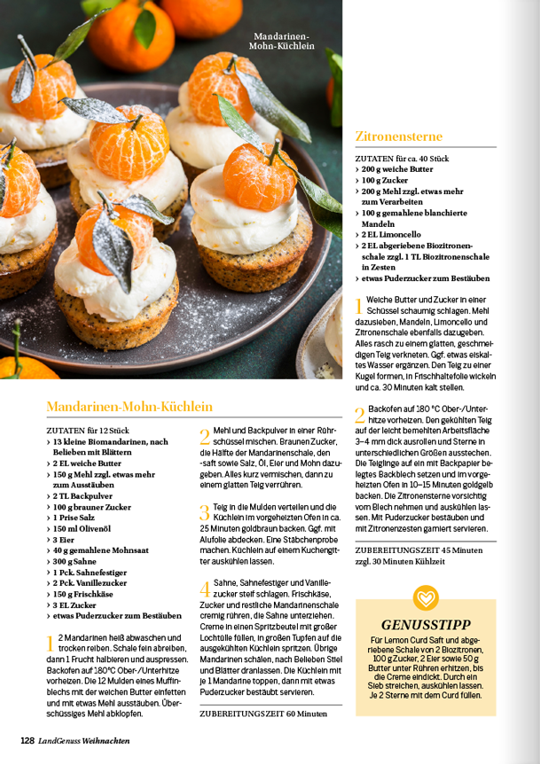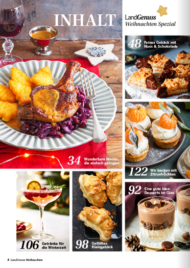 zu keiner Zeit des Jahres ist die Luft so erfüllt von köstlichen Düften wie in der Weihnachtszeit. Ob Sie nun ein traditionelles Festtagsmenü planen oder auf der Suche nach neuen Inspirationen für den Plätzchenteller sind, in unserem „LandGenuss“-Sonderheft werden Sie garantiert fündig. Freuen Sie sich auf knusperfeine Klassiker, Plätzchen aus dem Schokoladenhimmel sowie Aromatisches mit Lebkuchen und Spekulatius. Ein garantierter Hingucker auf Ihrer Kaffeetafel sind unsere kreativen Adventstorten. Wir sind uns sicher, unsere Gerichte versüßen Ihnen und Ihren Lieben die Vorweihnachtszeit. Für das Fest der Feste haben wir für Sie abwechslungsreiche Menüvorschläge zusammengetragen. Mit kulinarischen Geschenken machen Sie Ihren Liebsten eine Freude und mit Bastelideen sorgen Sie für winterliches Ambiente. Lassen Sie sich von der feierlichen Stimmung mitreißen und planen Sie auch gleich den perfekten Silvesterabend in gemütlicher Runde bei Raclette und passenden Drinks.