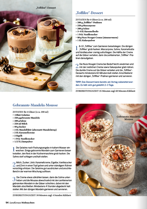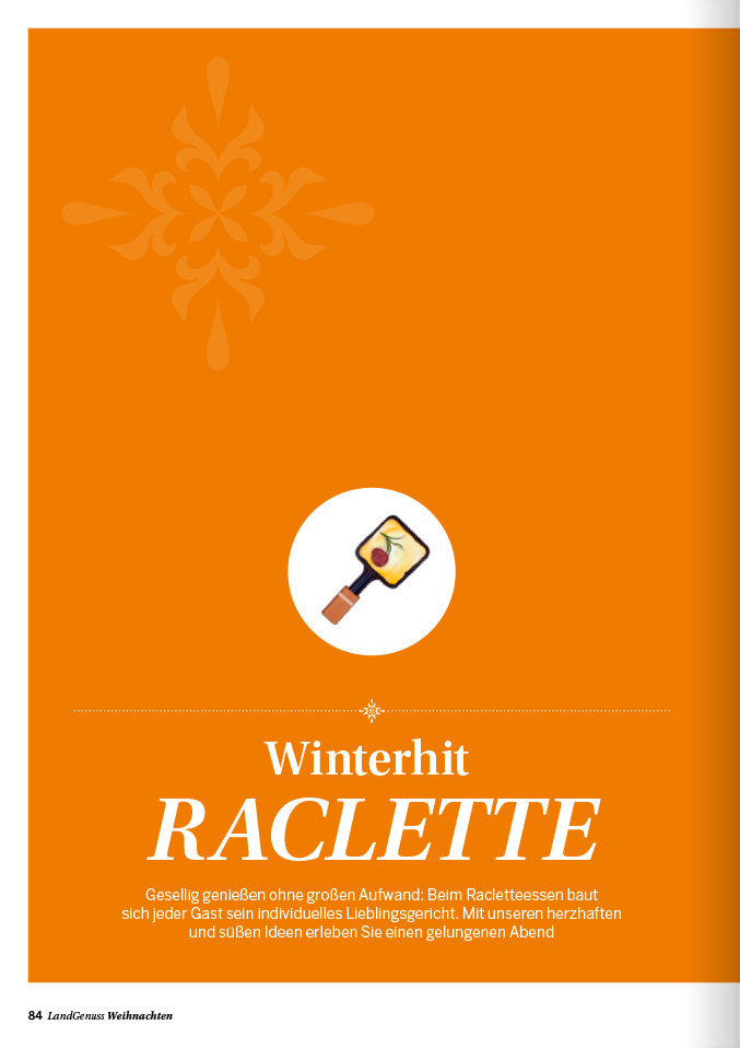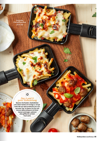 Erleben Sie die festliche Vielfalt mit dem „LandGenuss“-Weihnachts-Spezial! Genießen Sie himmlisch süße Verführungen – von Plätzchen über Pralinen bis hin zu Desserts im Glas für die große Tafel. Selbstgebackenes bietet sich dabei perfekt als Geschenk an. Entdecken Sie zudem abwechslungsreiche Drei-Gänge-Menüs, die Sie ganz individuell zusammenstellen können. Und für gemütliche Abende mit den Liebsten bieten wir kreative Racletteideen von herzhaften Handbroten und Pizzen bis hin zur süßen Cheesecake-Variation. Zum gemeinsamen Anstoßen liefern wir die passenden Getränke mit und ohne Alkohol.