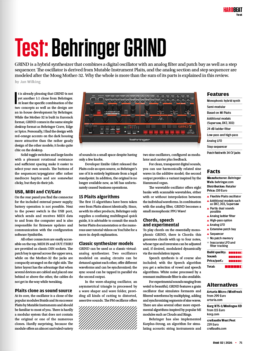 Hardware Review - Behringer GRIND: We stress-test this hybrid beast. With a digital oscillator (Plaits-derived) and an analog filter (Moog Mother-32 style), find out why this synth is more than just the sum of its parts.