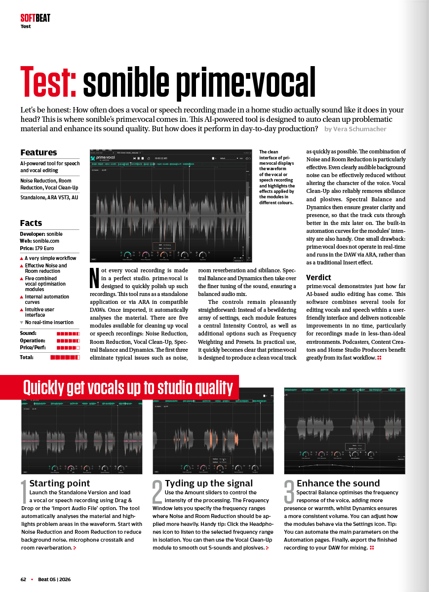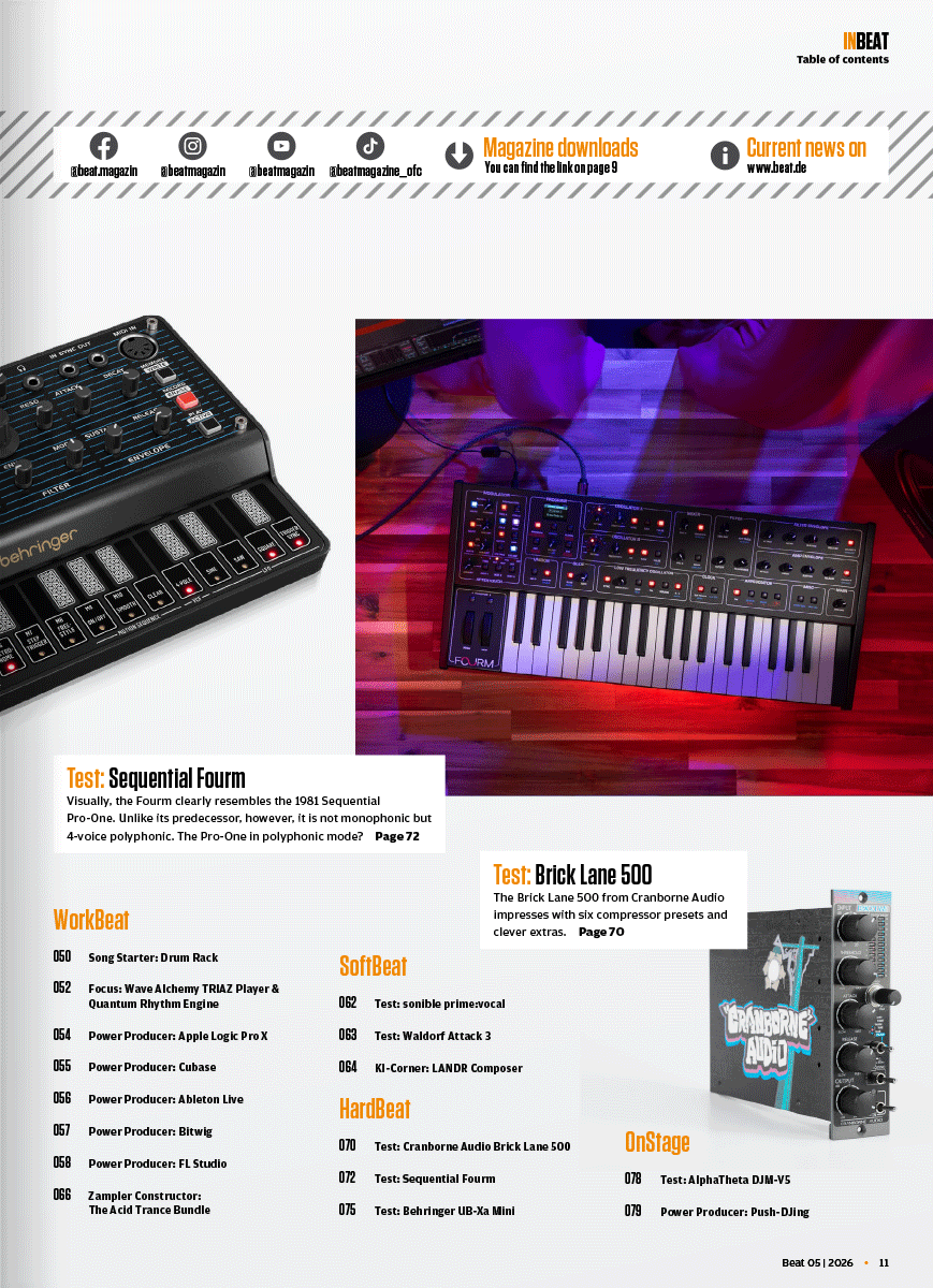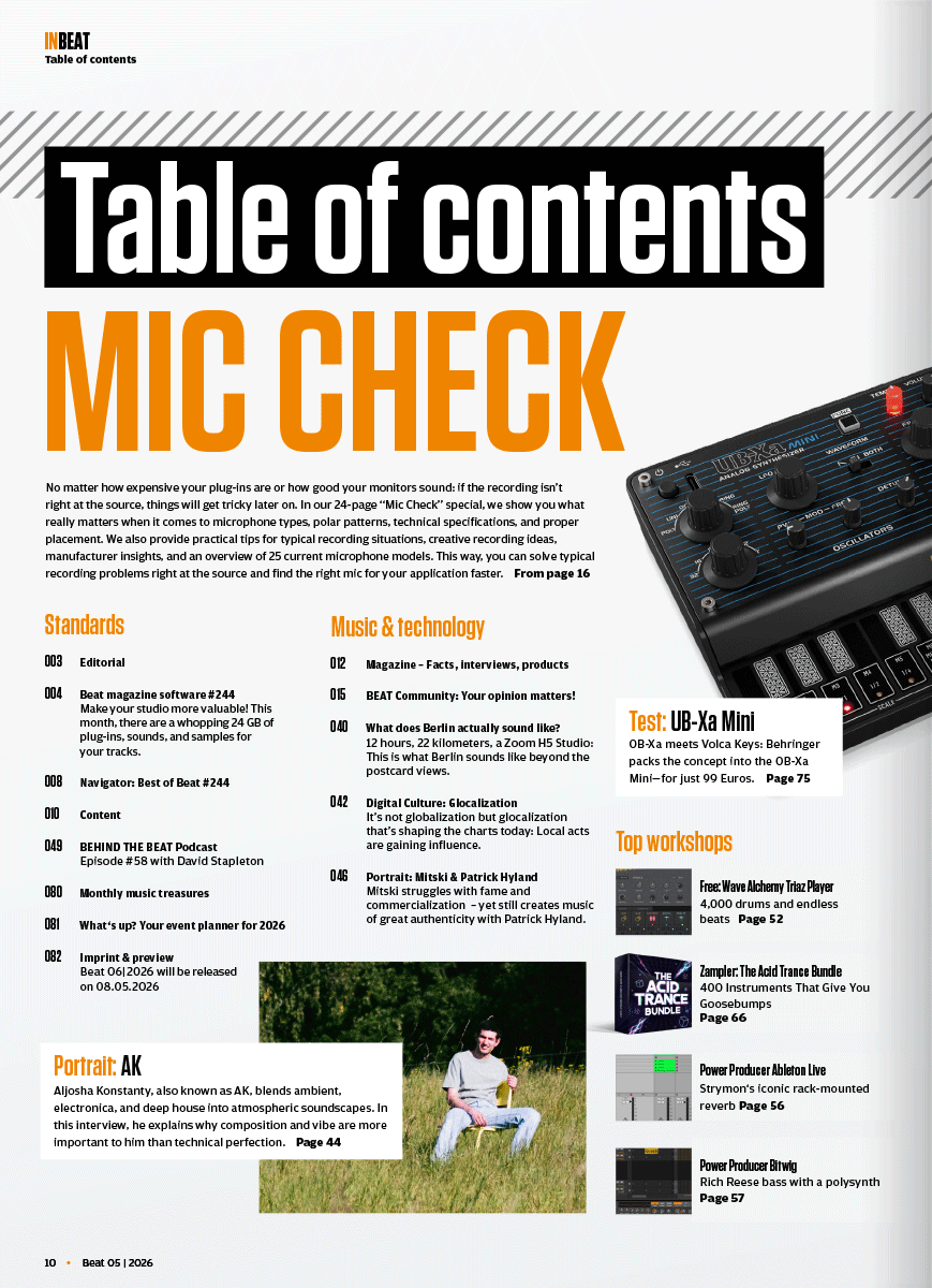 No matter how expensive your plug-ins are or how good your monitors sound: if the recording isn’t right at the source, fixing it later becomes a struggle. In our 24-page “Mic Check” special, we show you what really matters when it comes to microphone types, polar patterns, technical specifications, and proper placement. On top of that, you’ll find practical tips for typical recording situations, creative recording ideas, expert know-how, and an overview of 25 current microphone models. This way, you can solve common recording problems right at the source and find the right microphone for your application more quickly.