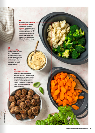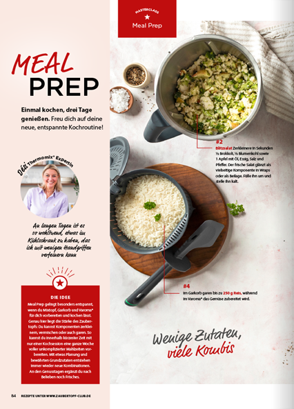 • Meal-Prep-Masterclass: Lerne, wie du mit Mixtopf, Garkorb und Varoma® in nur einer Koch-Session die Basis für 3 vollwertige Gerichte für 3 Tage vorbereitest.